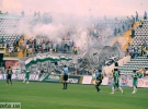 В половине второго тайма болельщики из Харькова начинают бросать на беговые дорожки зажженные файеры. Пожарные тушат их водой из шланга. Потом несколько секунд льют воду на фанатов.