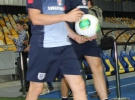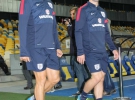 Национальная сборная Англии провела тренировку на поле "Олимпийского". Первые 15 минут занятия были открыть для журналистов. В это время футболисты не работали с мячом, а лишь разминались. Вратари занимались отдельно.