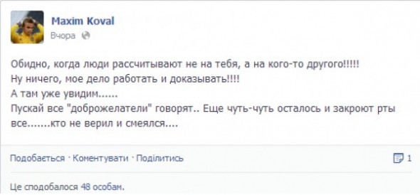 "Обидно, когда люди рассчитывают не на тебя, а на кого-то другого!!!!! Ну ничего, мое дело работать и доказывать!!!!А там уже увидим...... Пускай все "доброжелатели" говорят.. Еще чуть-чуть осталось и закроют рты все.......кто не верил и смеялся....", - написал Коваль на своей странице в Facebook.