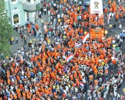 Напомним, вчера на стадионе "Металлист" состоялся матч Нидерланды - Германия, которому предшествовала традиционное шествие голландских фанов на стадион. К шествию, численность которой составляла 30 тыс. человек, присоединились немецкие фаны, а также жители и гости Харькова.