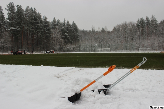 Перед началом тренировки 10 рабочих и техника готовили поле к встрече с футболистами. Журналисты шутили, что этот процесс следует снять на видео и послать в Ахтырку и Полтаву. В среду в этих городах отменили матчи Кубка Украины из-за замерзших полей. "Динамо" и "Шахтер" только потеряли время на дорогу. Теперь "Полтаве" и "Нефтянику" угрожают технические поражения 0:3.