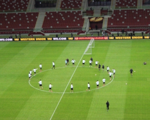Испанская "Севилья" провела тренировку на поле "Народового". Занятие длилось более часа и было полностью открытым для прессы. Интересно, что испанцы работали только на одной половине поля - по правую руку, если смотреть на поле с медиа-трибуны. Очевидно, организаторы пытались равномерно распределить нагрузку на газон, ведь "Днепр" тренировался на "левой" половине поля.