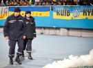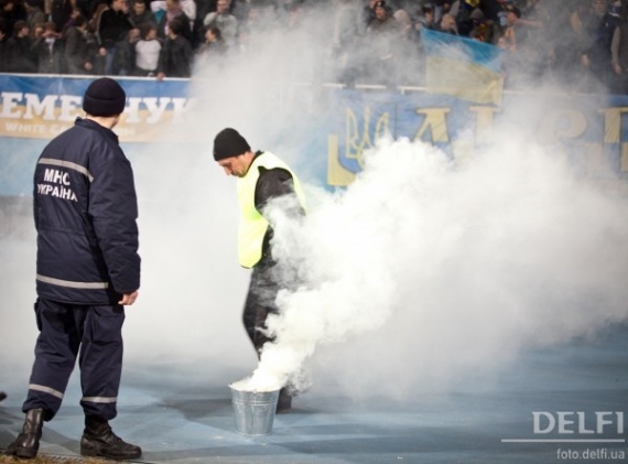Болельщики 29 марта вели более, чем раскованно. Вначале один из по сути устроил пожар на трибуне. В конце концов, с горящим флагом он спрыгнул с трибуны и двинулся в сторону поля.