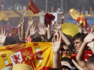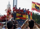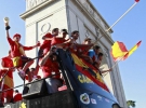 Затем сборная на открытом автобусе отправилась в путешествие по центральным улицам Мадрида. На всем протяжении маршрута болельщики встречали футболистов бурными аплодисментами и возгласами "Чемпионы! Чемпионы! Спасибо, чемпионы!". Весь город был одет в красно-желтые цвета национальной сборной: все, начиная с королевы Софии и всех без исключения телеведущих, освещающих праздник, до простых горожан, прохаживающихся по улицам. Некоторые даже раскрасили свои автомобили в национальные цвета, сообщает newsru.com.