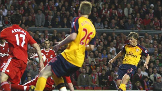Феерическая игра 33-го тура английской премьер-лиги между "Ливерпулем" и "Арсеналом" завершилась вничью со счетом 4:4, а главным героем матча стал российский форвард "канониров" Андрей Аршавин, отправивший в ворота мерсисайдцев четыре гола.
