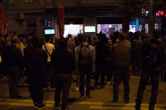 Хотел поинтересоваться мнением собеседника об избиении английских фанатов украинских ультрас, но не смог - соседи со всех сторон обступили с телефонами, то фоткаючы, то снимая на видео. Старший мужчина чуть не вылил на меня пиво, извинился, поставил бокал на землю, достал телефон и прямо перед глазами начал снимать видео.