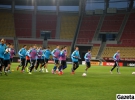 Футболисты осуществляют разминочную пробежку для разогрева, одновременно ассистенты тренера переносят тренировочные ворота. Отдельно от всех начинают заниматься голкиперы Андрей Пятов, Денис Бойко и Никита Шевченко. Ими руководит тренер вратарей Юрий Сивуха.