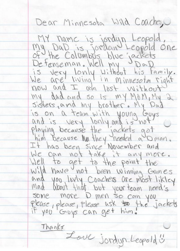 Американский защитник Джордан Леопольд перешел из "Коламбус Блю Джекетс" в команду "Миннесота Уайлд" после того, как 11-летняя дочь хоккеиста Джордин написала письмо руководству "Уайлд" с просьбой подписать контракт с ее отцом. Фото письма в своем аккаунте в Twitter опубликовал генеральный директор "Коламбуса" Ярмо Кекяляйнен.