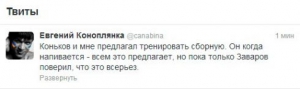 "Твиттер" лидера днепропетровского "Днепра" ошарашил откровенным комментарием: "Коньков и мне предлагал тренировать сборную. Он когда напивается - всем это предлагает, но пока только Заваров поверил, что это всерьёз".