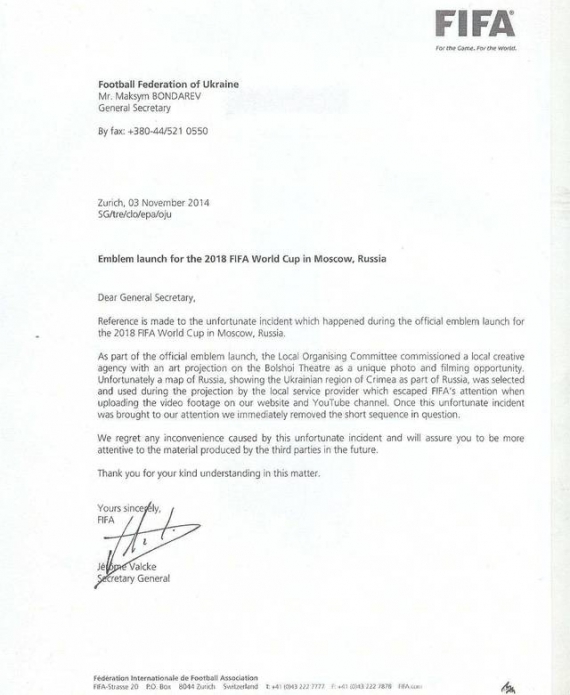 Федерация футбола Украины получила письмо от ФИФА, в котором международная футбольная ассоциация принесла свои извинения по поводу инцидента, который произошел во время презентации эмблемы Кубка Мира ФИФА-2018 в Москве.