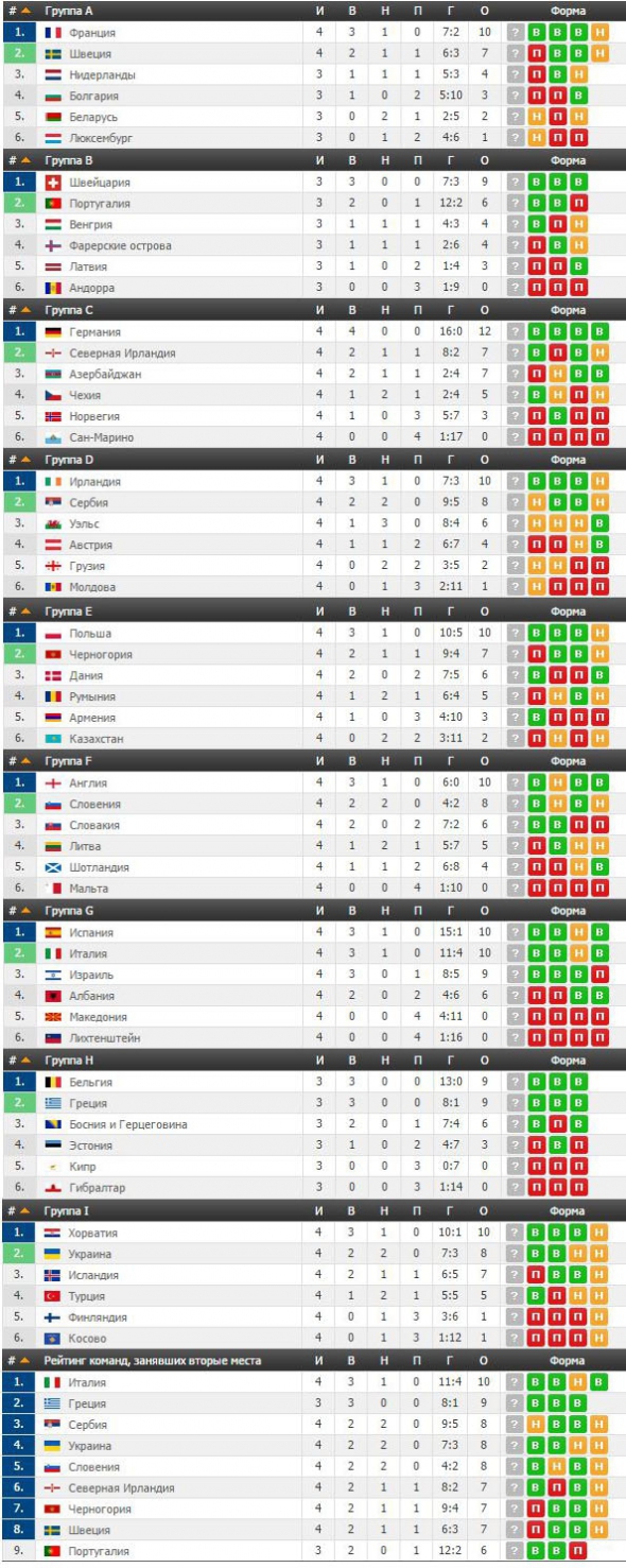 Соперники сборной Украины по группе I, Хорватия и Турция, с одинаковым счетом 2:0 обыграли, соответственно, Исландию и Косово. Сборная Хорватии после этой победы единолично возглавила группу. А сборная Украины в Одессе минимально обыграла финнов и расположилась на втором месте с отставанием от лидера на два очка.