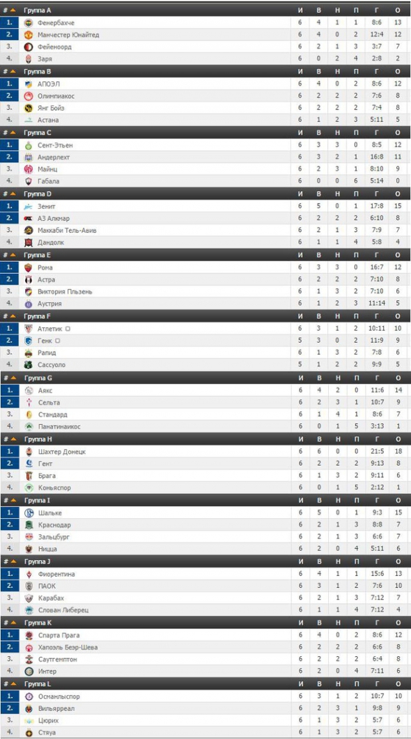 Состоялись матчи заключительного, 6-го тура Лиги Европы.