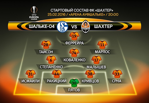 "Шахтер": Пятов, Срна, Кривцов, Ракицкий, Исмаили, Степаненко, Малышев, Марлос, Коваленко, Тайсон, Феррейра