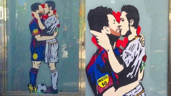 Художник, известный под псевдонимом Tvboy, изобразил лидеров "Реала" и "Барселоны" Криштиану Роналду и Лионеля Месси целующимися.