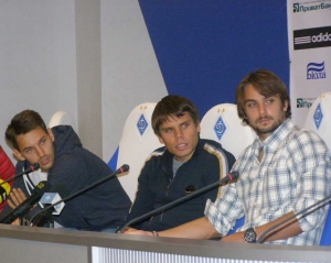 Футболисты киевского "Динамо" Милош Нинкович, Огнен Вукоевич и Нико Кранчар посмотрели жеребьевку группового этапа Лиги чемпионов вместе с болельщиками в конференц-зале стадиона имени Валерия Лобановского.