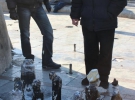 У активистов Майдана появилось новое развлечение. Они играют в шахматы большими садовыми фигурками. Доску расстелили возле памятника-фонтана основателям Киева.