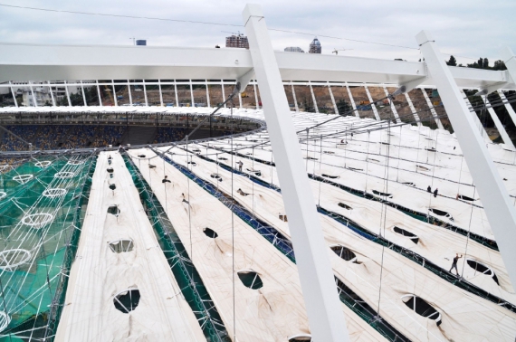 В конце прошлой недели на НСК "Олимпийский" было установлено 40 секторов мембранного покрытия. Это ровно половина из 80 секторов крыши. По состоянию на понедельник, 21 августа, на главной спортивной арене страны было смонтировано 44 сектора мембраны.