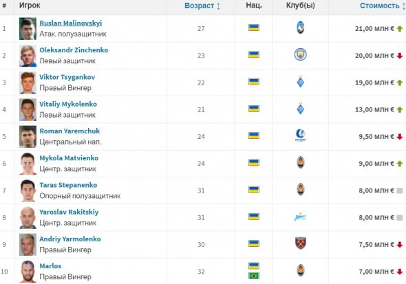 В пятерку попали - Виталий Миколенко и Роман Яремчук. Динамовец стоит €13 млн, а форвард "Гента" - €9,5 млн.