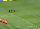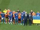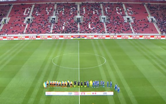 Футболисты "Шахтера" вышли на поединок с флагами Украины. На футболках обеих команд была надпись "Остановите войну" (Stop war). Вместо фамилий у "горняков" были названия городов Украины, которые бомбят рашисты.