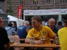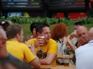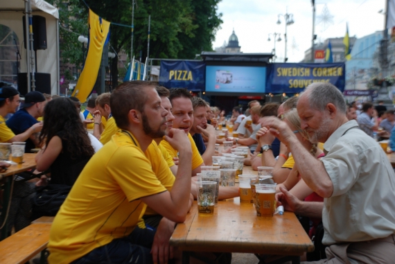 Шведы сидят преимущественно крупными компаниями по более десяти человек. Они пьют пиво и шумно кричат ??свои футбольные речевки. Рядом с ними сидят и украинские болельщики.