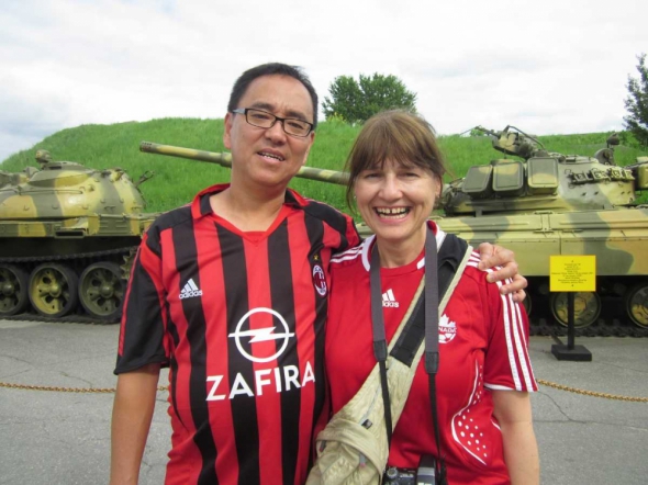 "А что это у вас такое? Напоминает мне Нью-Йорк. Музей Великой Отечественной войны? О, пойдем туда! Мои родители были итальянскими коммунистами. После войны эмигрировали в Канаду. Отец в 30 лет имел троих детей на руках, потом родились еще 6-ро. Многие мне рассказывали о той войне. - Женщина тщательно фотографирует каждый танк и самолет. В настоящее время пара других футбольных фанов в футболках сборной Италии фотографируются на фоне группового барельефа солдат. - Я не люблю фотографироваться на фоне таких вещей. Зачем мне моя улыбающаяся физиономия на фоне таких страданий? Моя мама бы плакала. Я знаю, что говорю. Переведите мне, о чем эта старая песня из динамиков ".