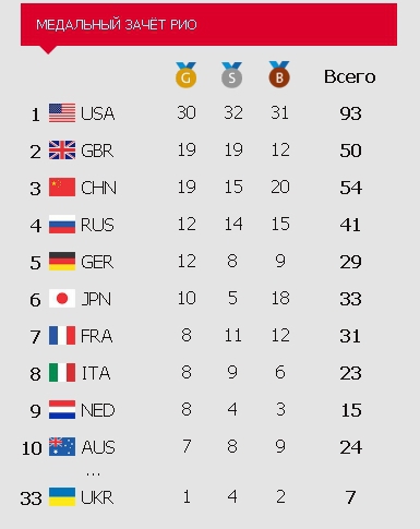 В медальном зачете сборная Украины по-прежнему 33-я, имея в активе 7 медалей, - 1 золотую, 4 серебряные и 2 бронзовые.