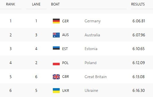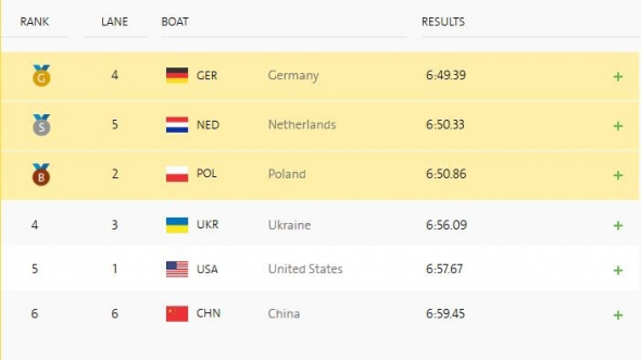 Золотые медали завоевала Германия (6:49.39)."Серебро" досталось Нидерландам (6:50.33), а "бронза" – у Польши (6:50.86).