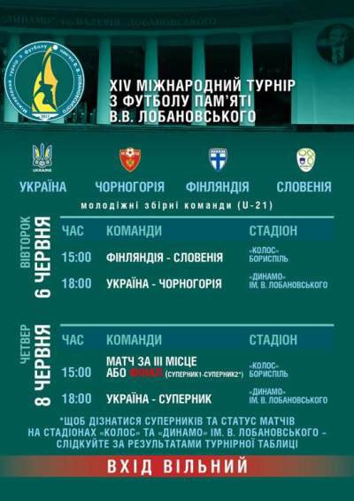 6 июня в Киеве и Киевской области стартует XIV международный футбольный турнир памяти Валерия Лобановского. Вместе с молодежной сборной командой Украины (U-21) участие в соревнованиях примут ее сверстники из Черногории, Финляндии и Словении, которая победила в этих соревнованиях в 2015-м