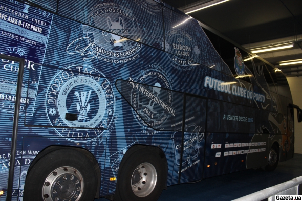 Чтобы попасть на трибуну нужно лифтом подняться на третий этаж. С минус третьего. А перед тем пройти у входа в раздевалки команд. Перед ним припаркован клубный автобус "Порту". Он огромный, в два этажа, и очень красивый. Разрисованный драконом, который дышит пламенем и трофеями, которые клуб выигрывал в своей истории.