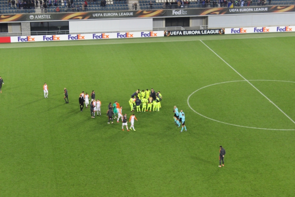 После финального свистка игроки "Гента" собрались в круг. Нелегко во второй раз пропускать 5 голов, но футболисты пошли благодарить фанатов за поддержку.