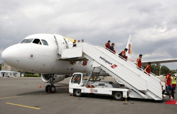 Первый финалист Евро-2012, команда Испании, в четверг днем прибыл в столицу Украины, где 1 июля "Фурия Роха" попытается во второй раз подряд завоевать Кубок Европы. Самолет сборной Испании прилетел в Киев около 13:30.