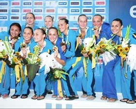 Украинские синхронистки Лолита Ананасова, Елена Гречихина, Дарья Юшко, Анна Хмельницкая, Анна Клименко, Ольга Кондрашова, Александра Сабада, Катерина Садурская, Ксения Сидоренко и Анна Волошина стали серебряными призерами, набрав 93,420 балла и уступив испанкам 2,18 балла. Бронзу взяли итальянки (90,44).