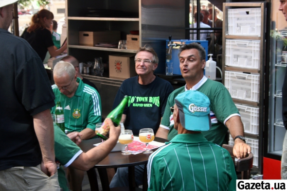 В день матча против "Шахтера" фанам венского "Рапида" во Львове было нескучно. Кое-кто любовался центром города, но немалое количество болельщиков оккупировали большинство центральных кафе, развлекаясь за бокалами местного пива.