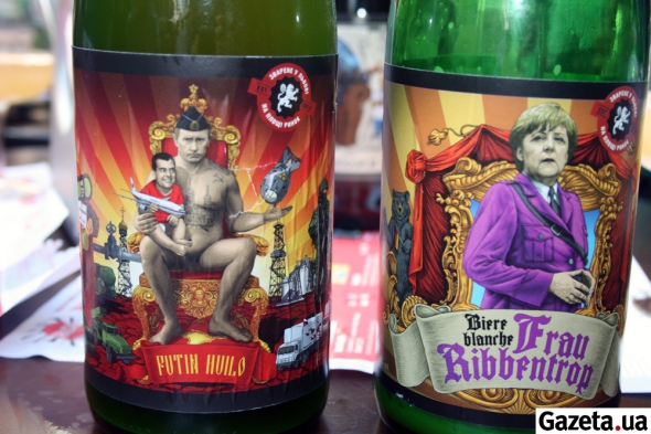 Внешне кажется, что пытаются попробовать все пиво, которое есть в ассортименте. На столе одной из компаний - несколько начатых бутылок. Просят еще, при этом сами же пытаются их открыть, не давая это сделать официантам. На этикетках - комические изображения известных политиков - Барака Обамы, Ангелы Меркель, Владимира Путина.
