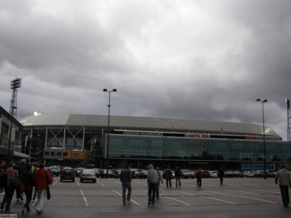 За час до матча на подходе к стадиону "Фейеноорда" слышен шум трибун. У ворот небольшие очереди. Стюарды тщательно обыскивают каждого болельщика - проводят руками по конечностях, спине, животе, очень придирчиво осматривают карманы и капюшон.