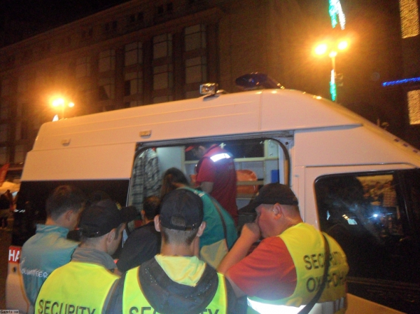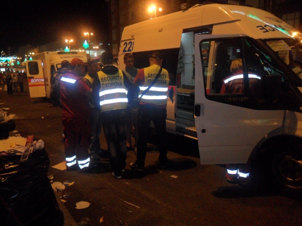 Охранники помогли дотянуть человека до машины "скорой". Все время рядом с иностранцем были двое волонтеров "Евро".