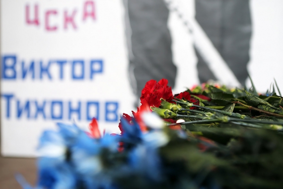 Гроб с телом покойного был установлен прямо на ледовой площадке. На трибунах выложили большой баннер с надписью "Легенда навсегда". Родственники Тихонова расположились в центре хоккейной коробки, рядом с усопшим.