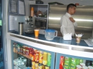 Буфет находится в третьем вагоне. Кофе продают по 10 грн, чай - по 6 грн. За 50 грн салат с ветчиной, сыром и помидорами в ланч-боксе. К нему прилагается маленький сок. Также есть вода, шоколад, чипсы и орешки. Столов и стульев в буфете нет. Пассажиры пьют чай и кофе, опираясь на металлические перила у окна. "А чего вы сами не приносите пассажирам заказ? За такие деньги уже можно было и принести", - сказала официантку одна из пассажирок. "Мы раньше так и делали. Но пассажиры жаловались, что долго заказ готовится. Так пусть теперь сами ходят", - ответила ей официантка Анна Кисиль.До Харькова поезд прибывает на 2 мин раньше - в 10.41.