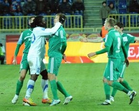 В той игре камерунский полузащитник "Днепра" получил красную карточку за грубую игру против Янузи, а затем грубо оттолкнул подбежавшего к нему Безуса.