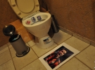 Наибольшее внимание привлекает туалетная комната. Внутреннюю поверхность унитаза обклеили эмблемами ненавистных клубов, а на пол перед унитазом бросили фотографию капитана "Шахтера" Дарио Срны.