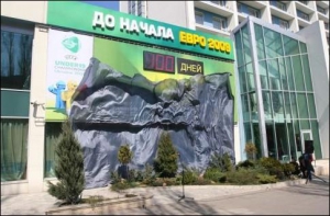 Электронное табло смонтировано на фоне подмигивающих донбассиков — забавных человечков, которые являются официальными талисманами турнира. Напоминание о будущем празднике красуется на фасаде гостиницы "Атлас", на набережной реки Кальмиус, где этим летом разместится штаб-квартира турнира. По словам организаторов акции, возможно, подобную фишку, только в гораздо больших размерах и количестве, используют и в других городах Украины в канун Евро-2012.