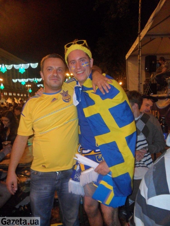 "Украина никогда не выигрывала на "Донбасс Арене". Слышите, никогда. Ну чего Блохин Шевчука не выпустил во время игры на поле? Мы все этого ждали. Тогда счет был бы другой, - возмущается парень в желто-синей футболке. - Вы знаете английский? Переведите Саймону, что я болею за Швецию и хочу с ним сфотографироваться".
