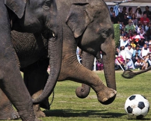 На поле размером с футбольную площадку и со стандартными футбольными воротами слоны продемонстрировали, что тоже умеют играть в популярную во всем мире игру.