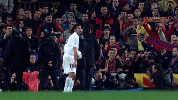 21 октября 2000-го Фигу впервые приехал в Барселону в статусе игрока "Реала". На "Камп Ноу" сплошь и рядом встречались плакаты, посвящённые португальцу. "Мразь", "Иуда", "Предатель", "Наёмник", – это лишь некоторые оскорбления, адресованные португальцу теми, чьим любимчиком он был совсем недавно. Каждое получение мяча португальцем встречалось оглушительным рёвом, а на поле летели самые разные предметы. Из-за накаленной обстановки португальца, основного исполнителя корнеров в "Реале", не подпускали к угловому флажку на "Камп Ноу", дабы сохранять максимальную дистанцию между полузащитником и фанатами. Следующие два "эль класико" Фигу пропустил из-за травмы, но в ноябре 2002-го вновь приехал на "Камп Ноу" и был встречен так же "тепло", как и при первом визите. Теперь португалец не стеснялся подавать угловые, так что на поле летело ещё больше предметов, чем в октябре 2000-го. Болельщики "блауграны" не жалели бутылок, монет, телефонов. А кто-то даже пожертвовал копчёной свиной головой. На 73-й минуте арбитр Медина Канталеха увёл команды в подтрибунное помещение и вернул их на поле только спустя четверть часа. Пожалуй, это самый известный и громкий скандал в истории испанского "класико".