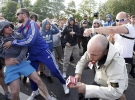 Два человека с окровавленными головами были доставлены в полицейские машины представителями органов правопорядка. Пока неизвестно, являются ли пострадавшие гражданами России.