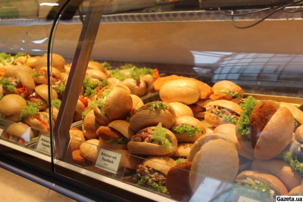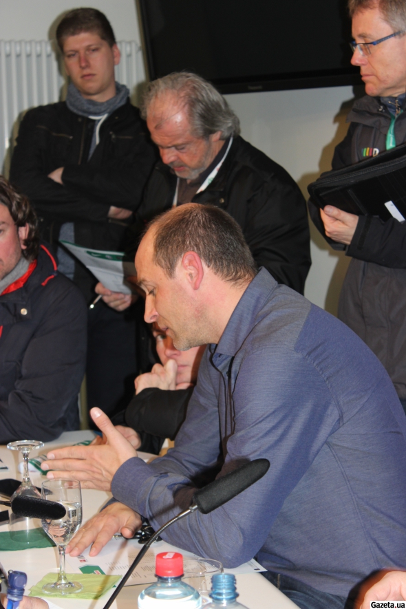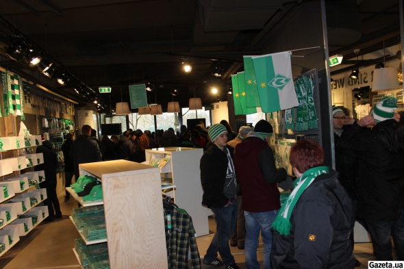 Пока мы говорили мимо прошел еще один гость из Мюнхена с шарфиком с матча "Бавария" - "Шахтер". Хотела сфотографировать, но легче найти иголку в стоге сена, чем его в этом море красных и зеленых шарфиков.
