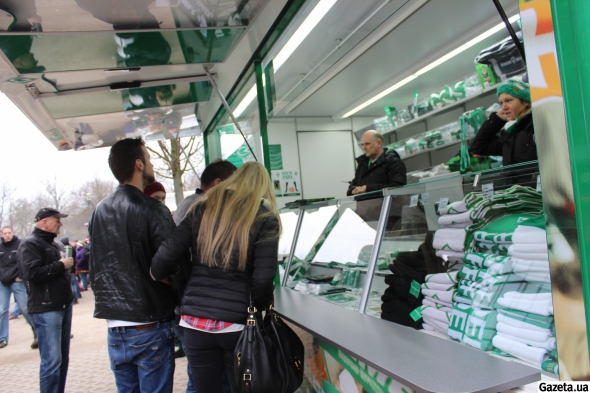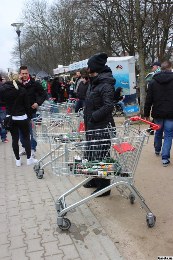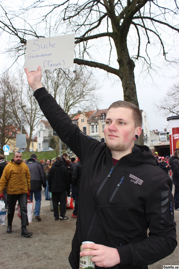 "Мы приехали из Мюнхена. У нас есть билеты на хорошие сидячие места, но мы хотим обменять их на стоячие. Мы - ультрас и не любим поддерживать команду сидя", - сказали ребята. При обмене они теряют в деньгах, ведь сидячие места здесь намного дороже стоячих. Но это их мало волнует.