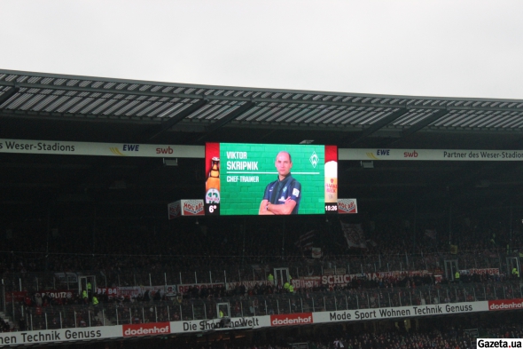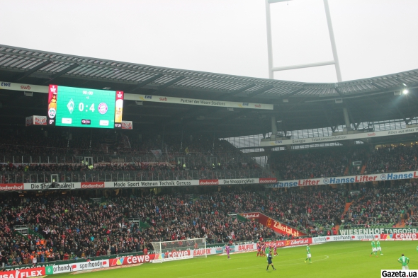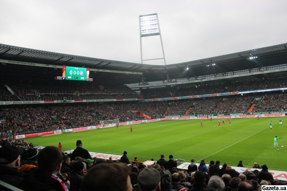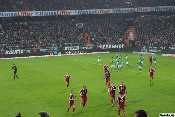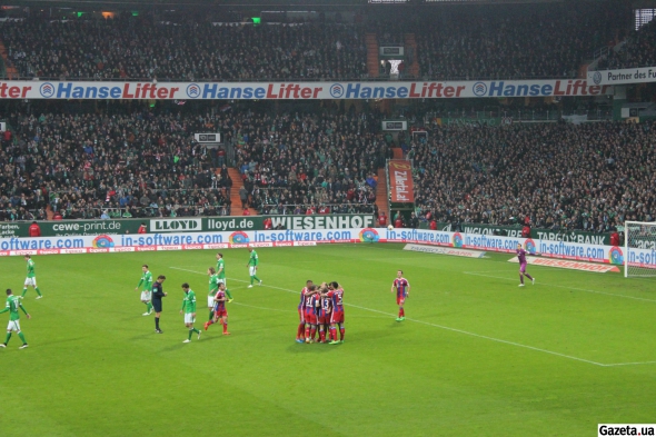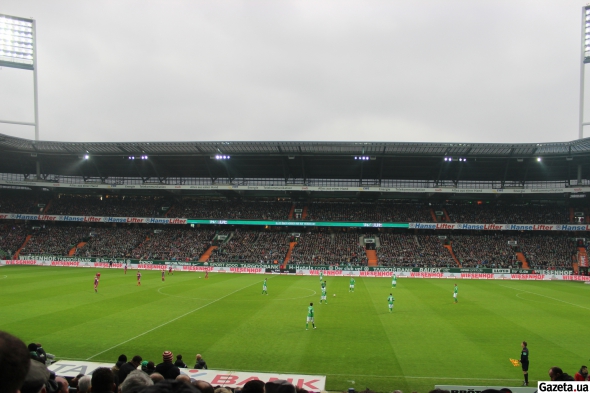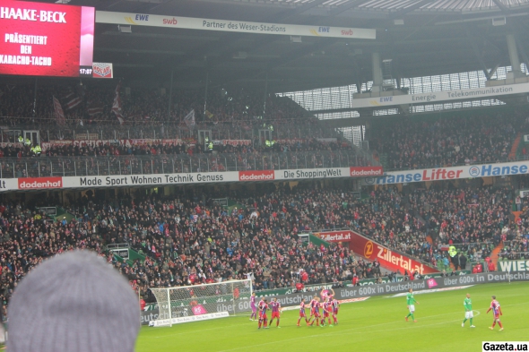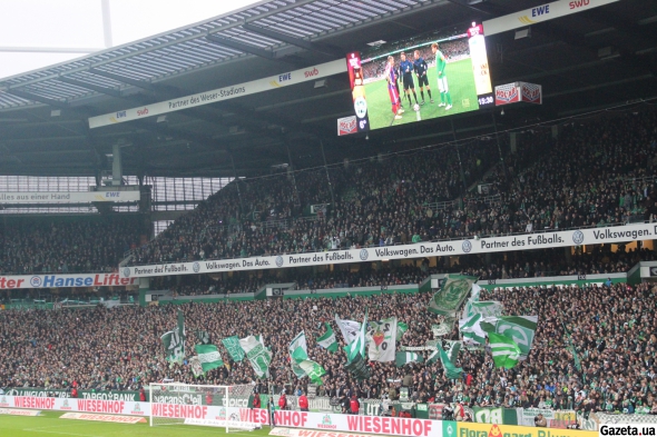 За несколько минут до стартового свистка "Везерштадион" затянул клубный гимн. Само собой, что все болельщики пели стоя.