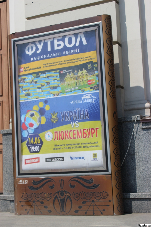 В воскресенье сборная Украины сыграет с Люксембургом матч отбора на Евро-2016. Встреча пройдет во Львове на "Арене-Львов" и начнется в 19:00. О поединке в городе знают. Вот такая афиша встречает пассажиров железнодорожного вокзала.
