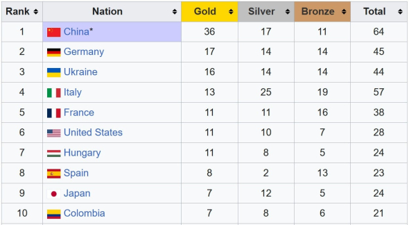 Сборная Италии по суммарному количеству медалей уступила только Китаю, однако из 57 наград итальянцев только 13 были золотыми, что принесло команде всего 4 место в итоговом медальном зачете.